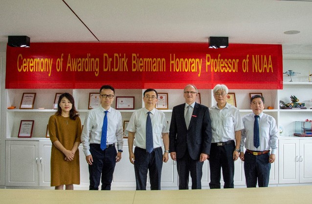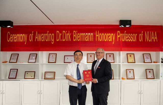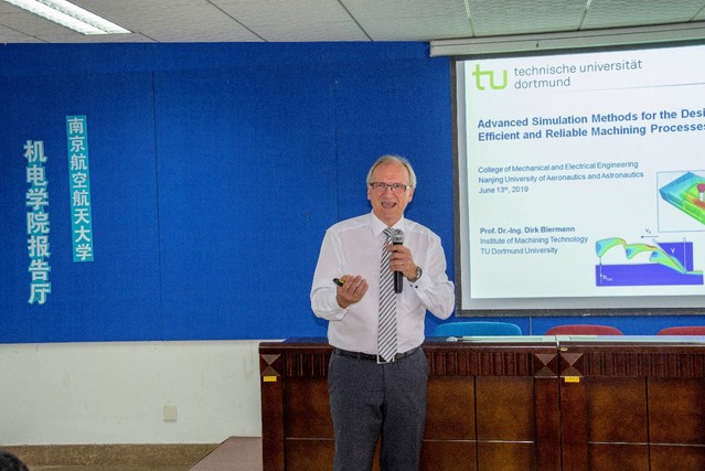 授予仪式由51吃瓜 副院长徐正扬主持,国际合作处处长张卓向与会人员介绍了Dirk Biermann教授的简历,副校长姜斌为Dirk Biermann教授颁发荣誉教授聘书并佩戴南航校徽。Dirk Biermann教授发表致辞,对南航及各位领导、老师表示感谢,并分享了他多年的学术经历,最后表达了与南航开展更加广泛合作和共同在专业领域做出更多贡献的愿望。受聘仪式结束后,Dirk Biermann教授在522会议室为我校师生作了题为《Advanced Simulation Methods for the Design of Efficient and Reliable Machining Processes》的学术报告。
