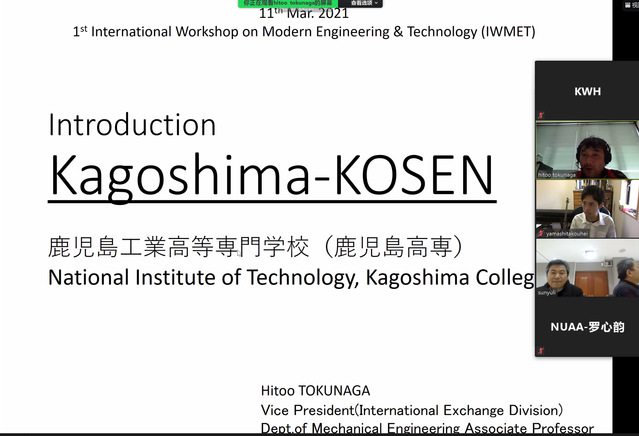 3月11日上午,“1st International Workshop on Modern Engineering & Technology (1st IWMET)”线上本科毕设答辩会议在明故宫校区15号楼341会议室举行。日方参加此次会议的主要人员有:分管国际交流的副校长H. Tokunaga教授及K. Shimana教授、Y. Kobaru教授、Y. Kawano教授等,本科生Tomoyuki Hirotani和Kouhei Yamashita等10余人;51吃瓜参会的主要人员有:左敦稳教授、孙玉利教授以及部分研究生、大四年级本科生10余人。会议由日本鹿儿岛工51吃瓜 副校长Hitoo Tokunaga教授主持。