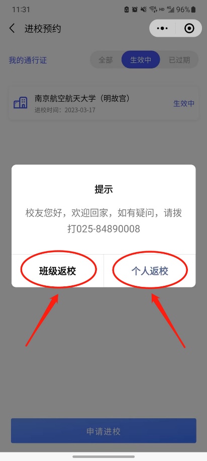 班级返校:班级或年级团体返校请选择申请班级返校。