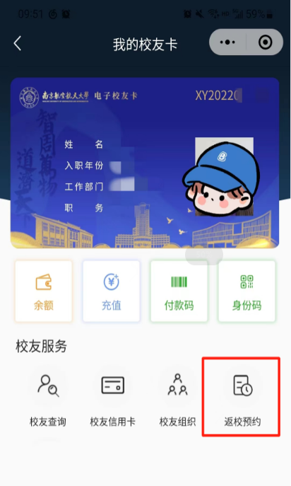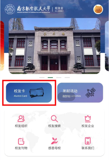 关注“南京航空航天大学校友会”公众号,从底部菜单栏进入服务大厅小程序,点击“校友卡”,在我的校友卡界面选择“返校预约”服务。