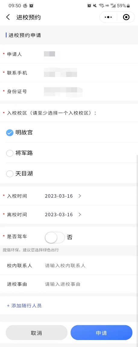 个人返校:填写预约表单,每位校友最多可添加两位随行人员,每次预约最长有效期为三天。