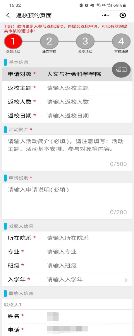 班级返校:班级返校提交申请后需等待工作人员与发起人联系,以便更好地在校园内开展相关活动。