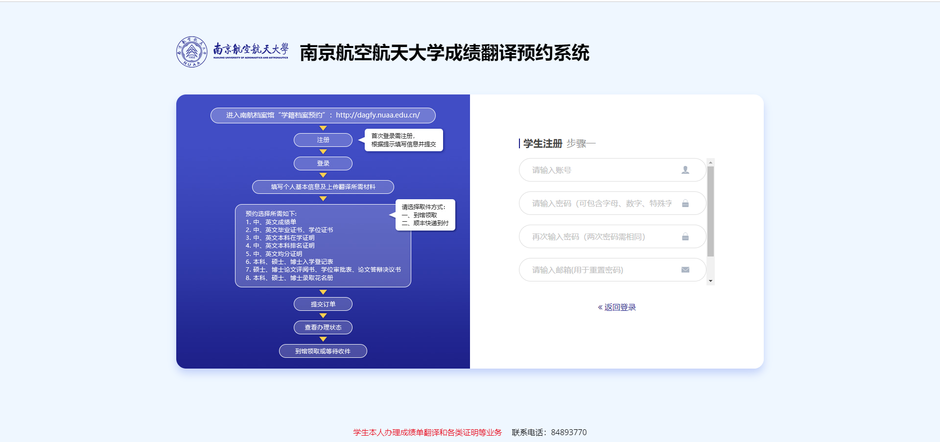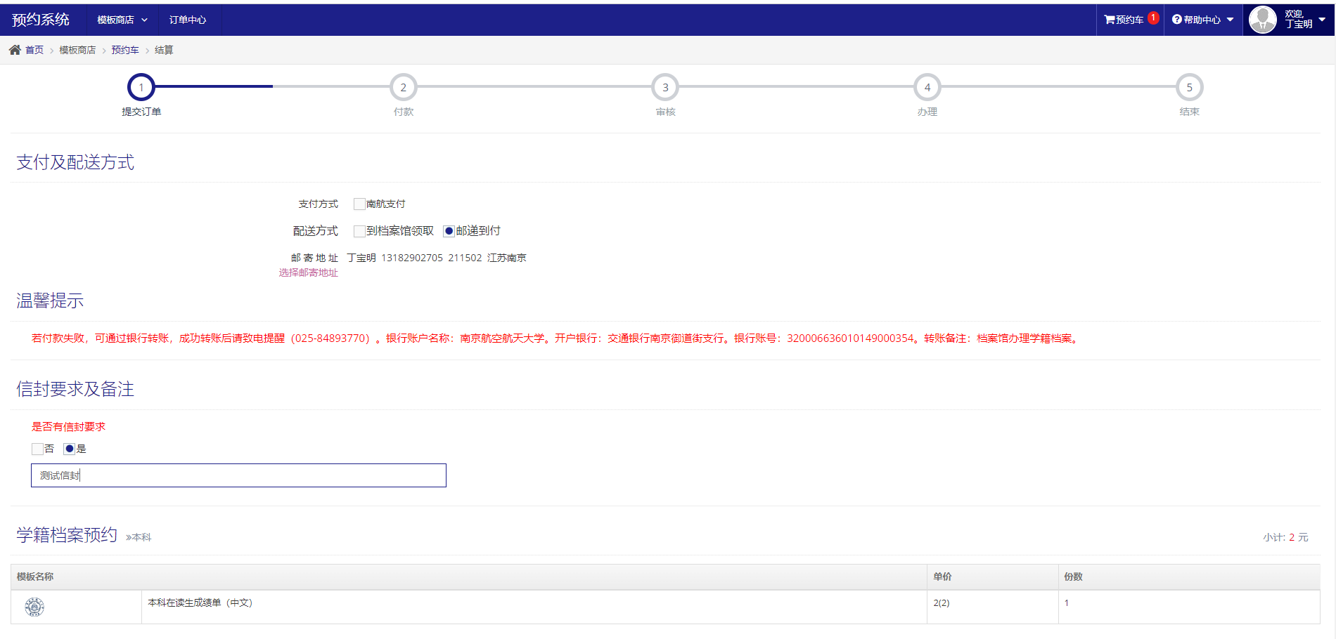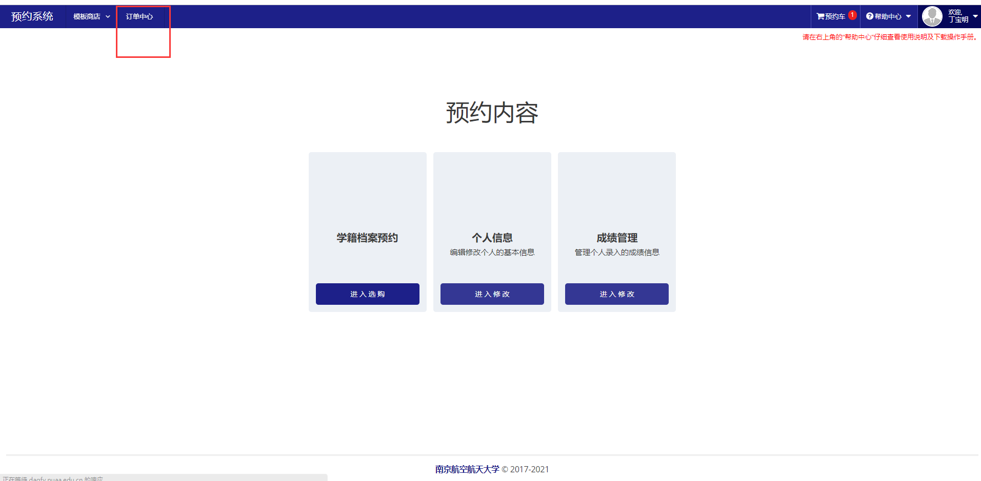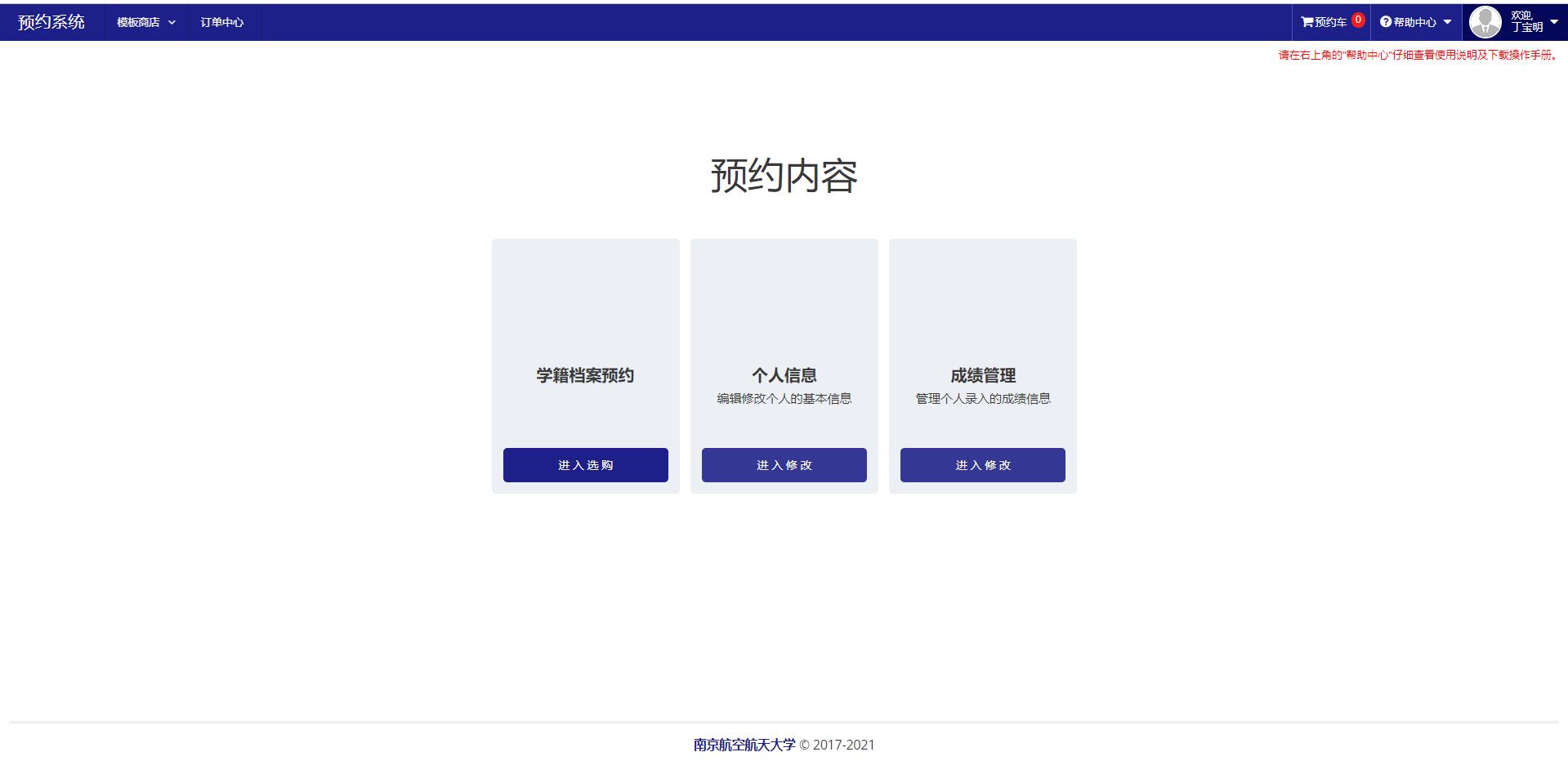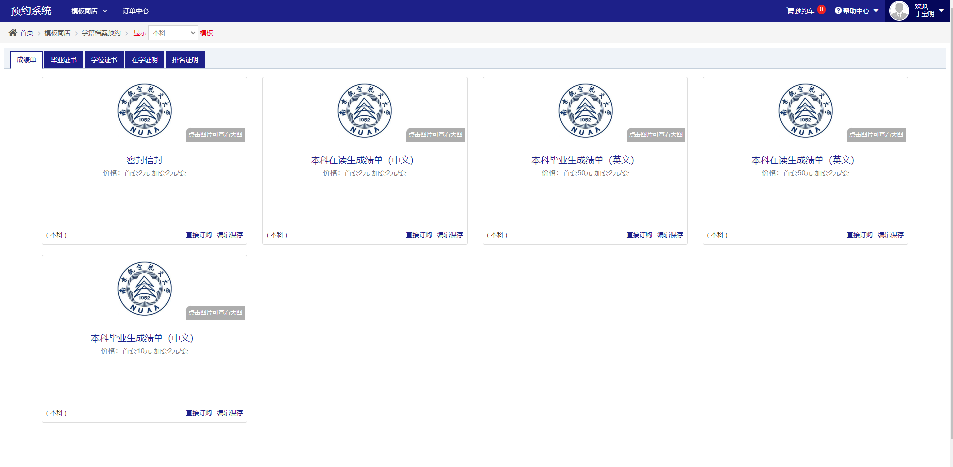 学籍档案预约:用户用于订购自己的需要的模板,成绩单、在学证明、毕业证明等等。