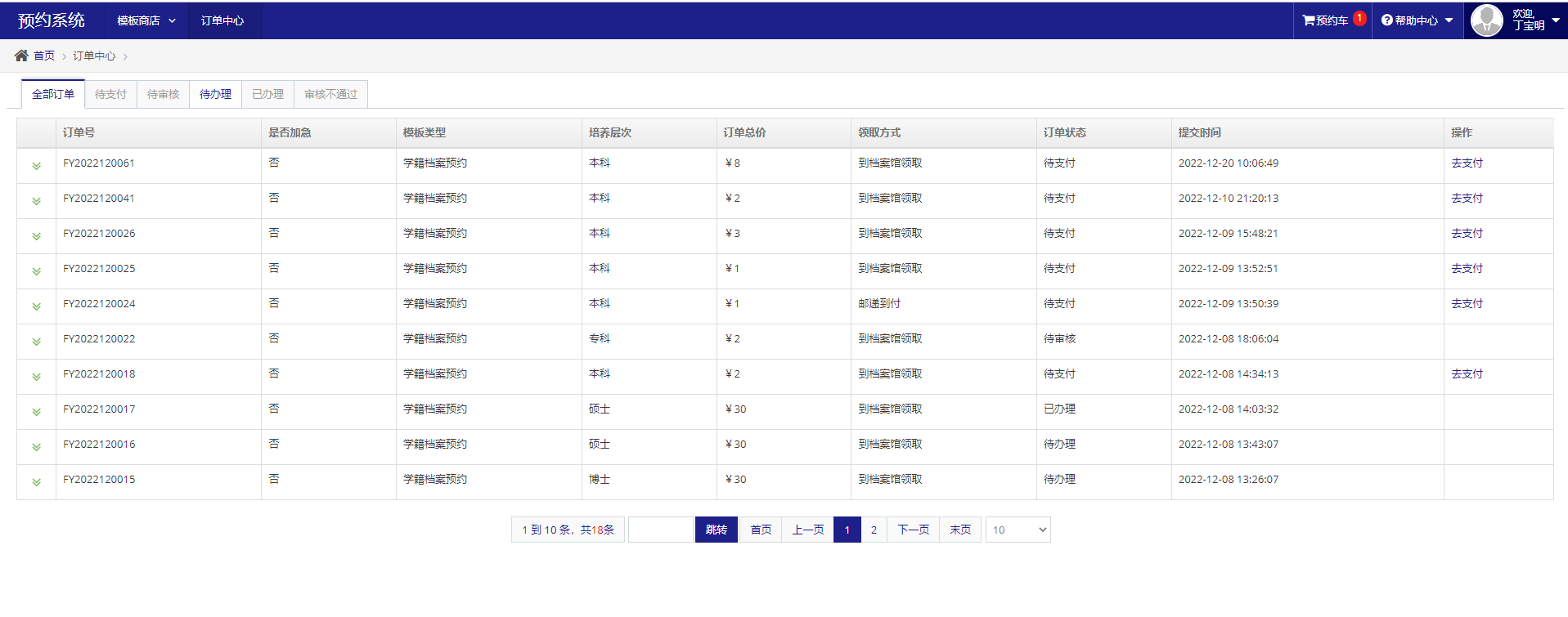 操作步骤6:支付成功的订单会进入订单中心页面,用户所有的订单都在此页面展示,审核不通过的订单会有不通过的原因以及反馈的附件,重新按要求改正可重新提交订单。
