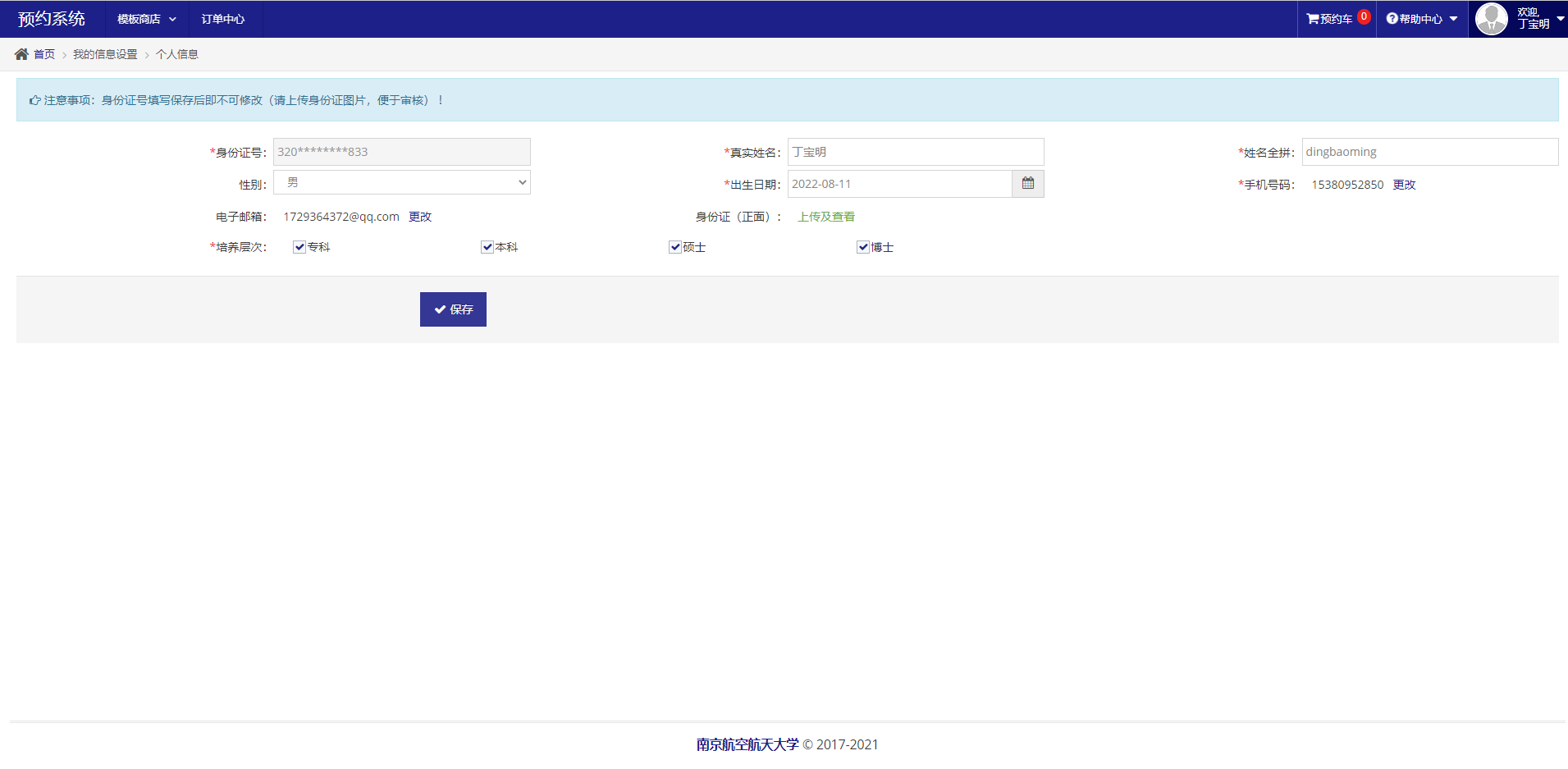个人信息:用户首次登录进入系统需填写自己相关的基本信息,身份证号和图片用于审核,手机号用于发送办理流程进度短信,培养层次用于区分订购的模板,出生日期,性别姓名等属于基本信息。