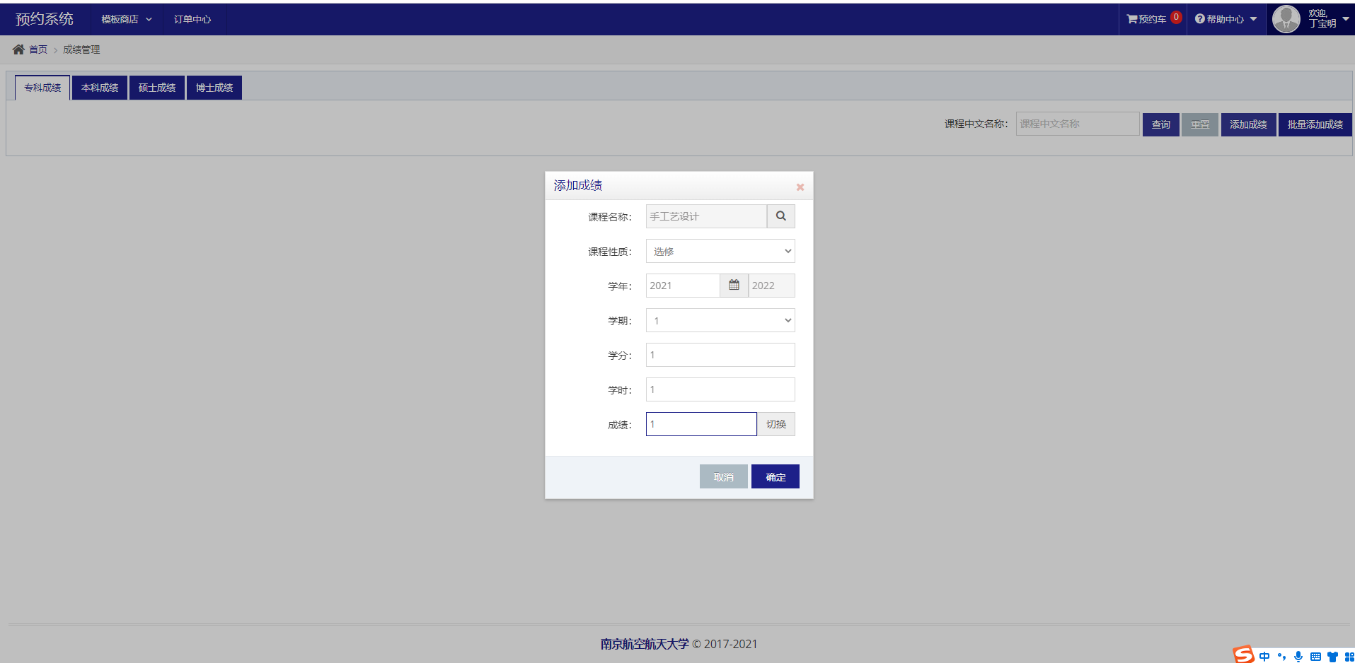 成绩管理:用户可输入自己相关历年成绩信息(如果用户查询不到自己相关的课程,请联系档案馆系统管理员84893770进行课程词库的添加)。