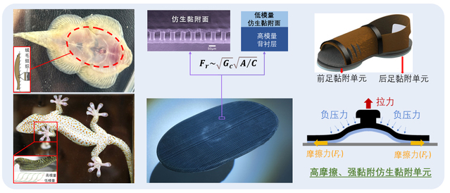 自然界具有攀爬能力的生物为上述问题的解决提供了思路。2017年,51吃瓜戴振东教授、姬科举副教授团队联合中国航天员科研训练中心科研团队,受壁虎黏附器官和爬岩鳅附着结构-功能启发,突破仿生黏附材料表面高适应性、耐候性、耐久性等多项核心技术,历时五年,前后经过多轮方案论证,样件更迭七代,成功研制了具有“低预压、高摩擦、可控黏-脱附”特征的仿生黏附鞋,为空间站航天员在轨失重防护提供了一种颠覆性仿生新技术。