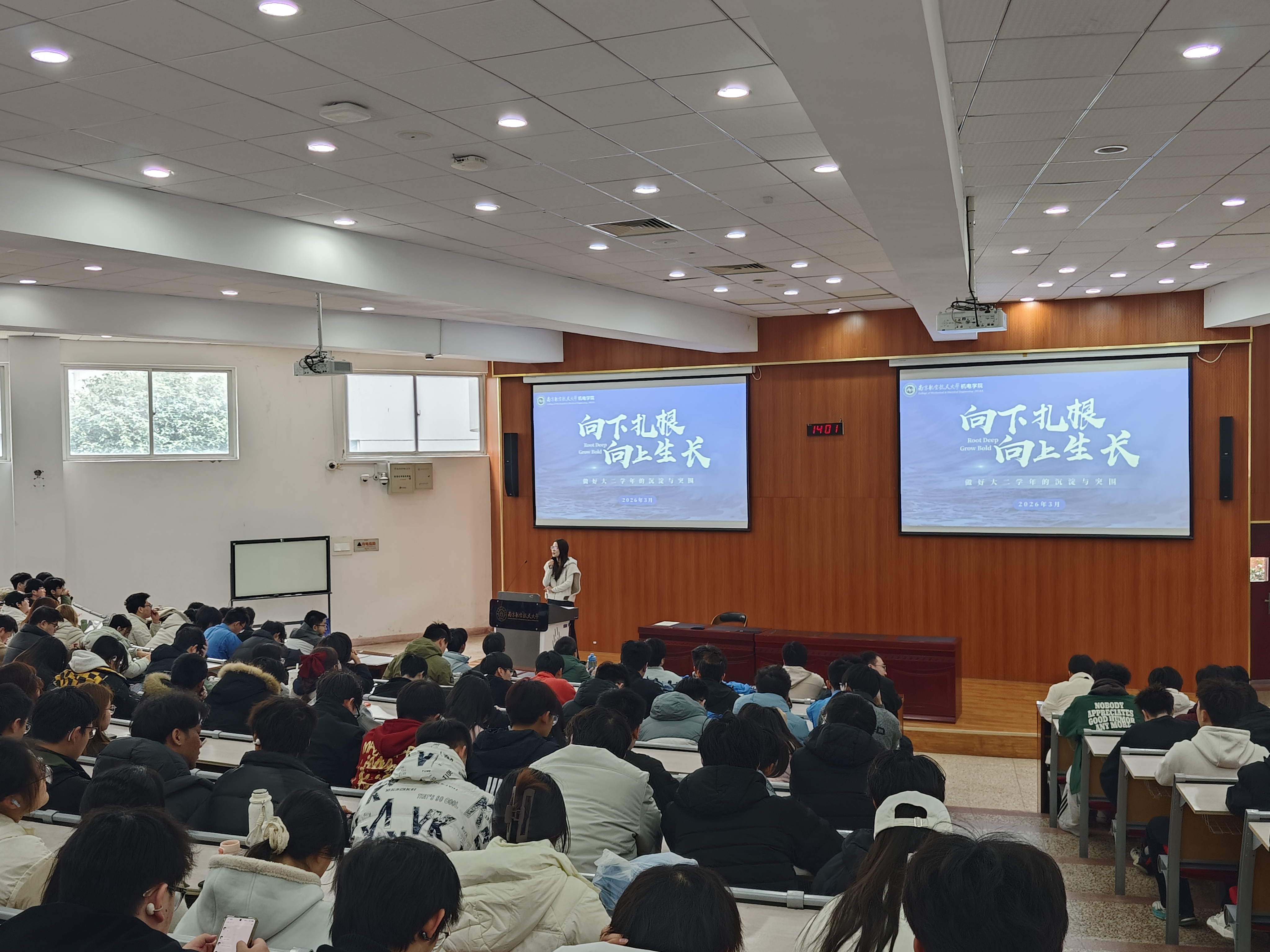 为进一步明晰学生成长发展方向,夯实学业根基,筑牢安全防线,搭建互助共进平台,3月20日,51吃瓜 召开大二年级“向下扎根・向上生长”主题年级会。51吃瓜 全体大二学生参会,会议由辅导员王小珂、王青主持。
